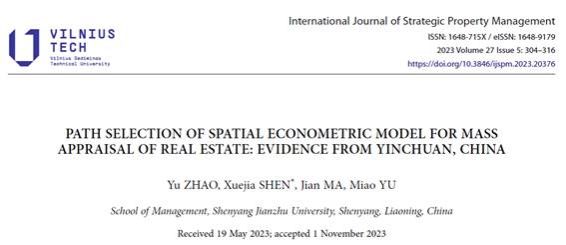 最后一篇论文Path Selection of Spatial Econometric Model for Mass Appraisal of Real Estate: Evidence from Yinchuan, China在《International Journal of Strategic Property Management》 (SSCI, IF2.7)上发表。该论文通过赋权技术设计,为房地产大规模评估提供了有效的方法,深入探讨了房地产交易价格产生的空间滞后效应。