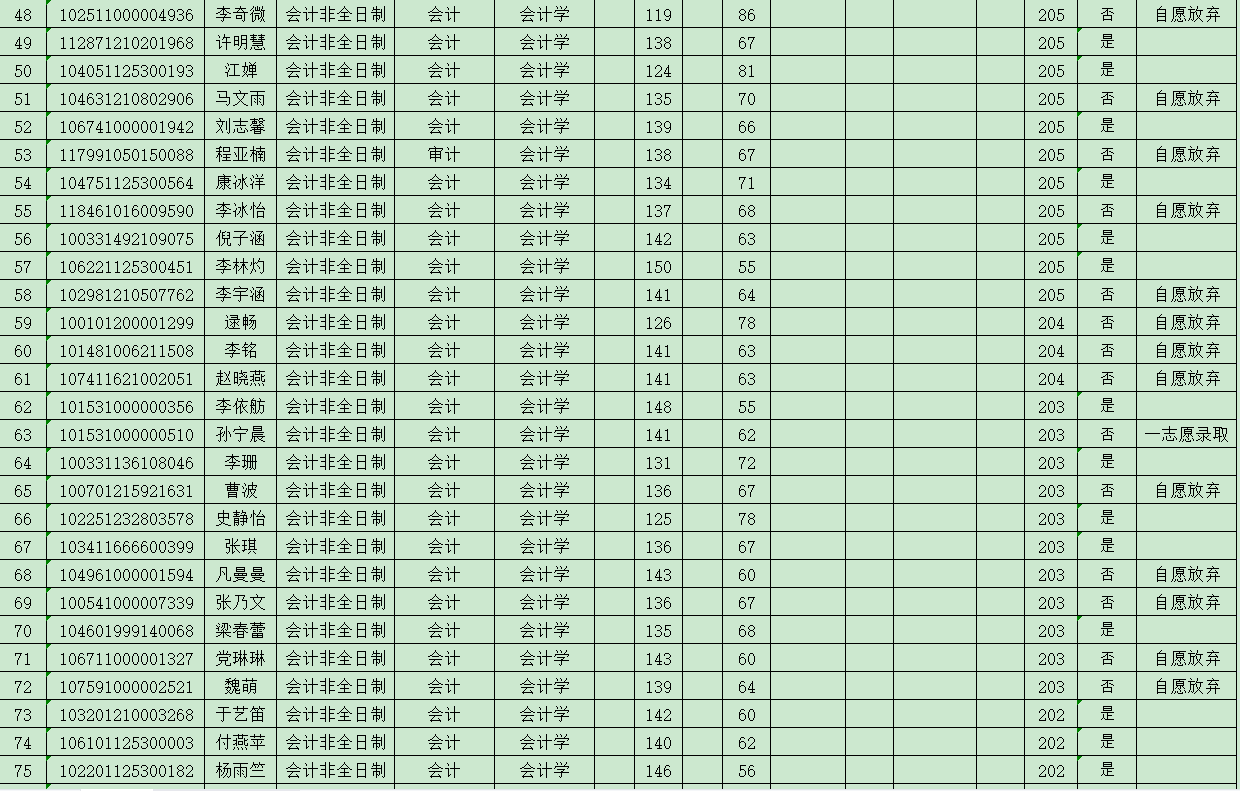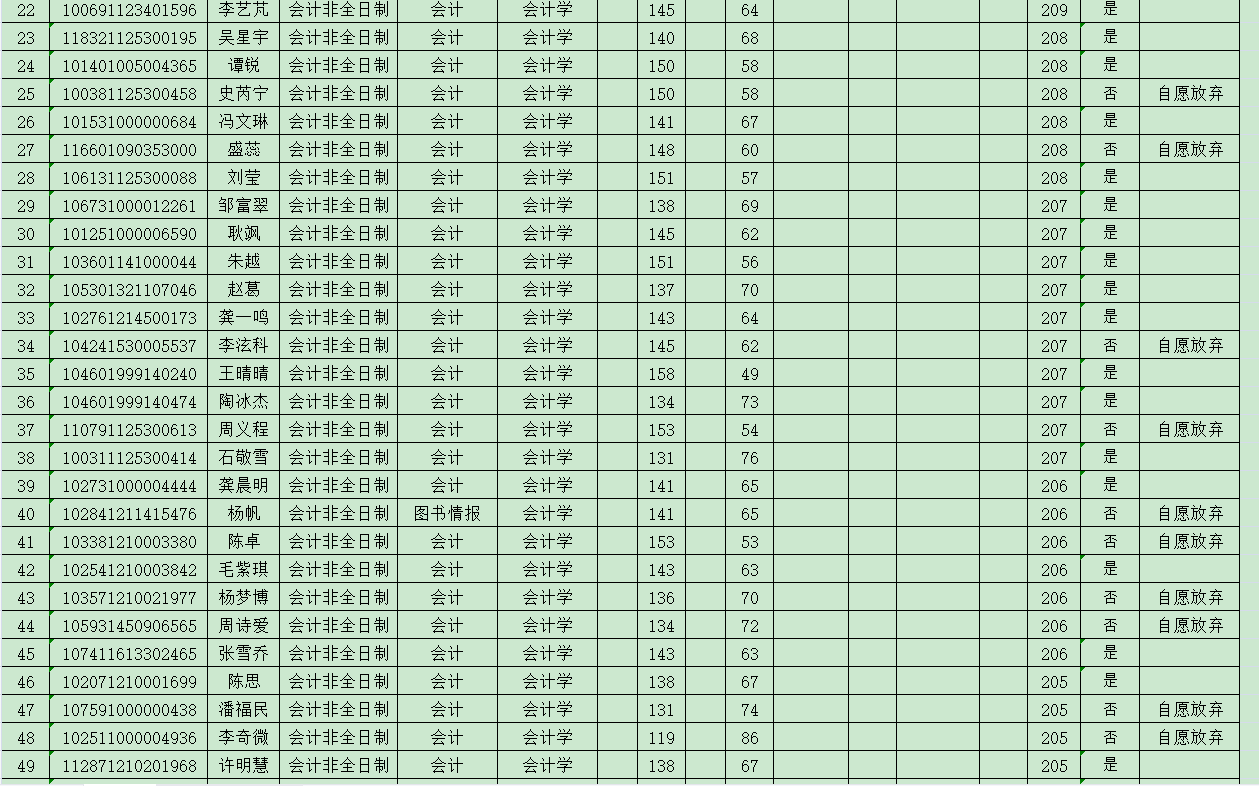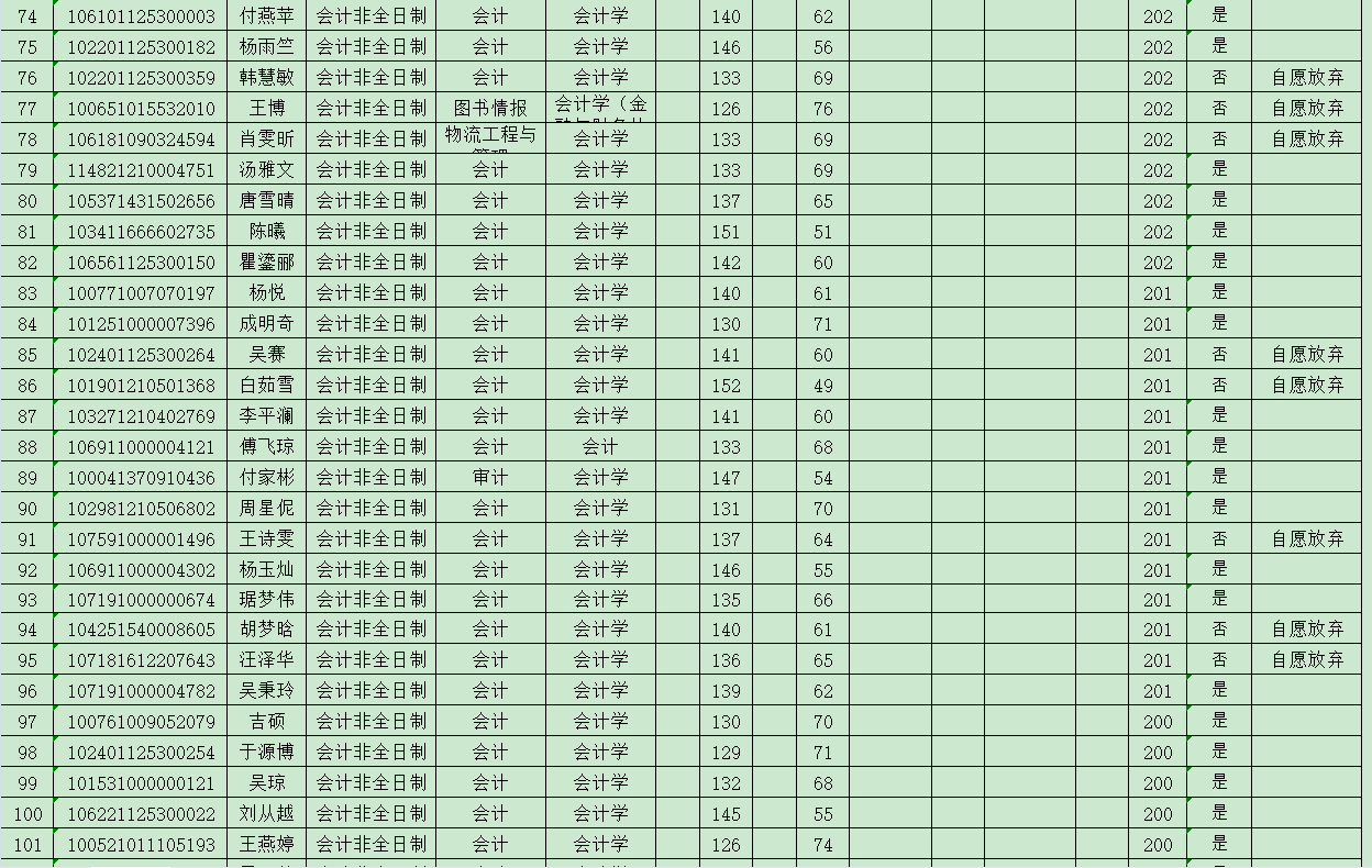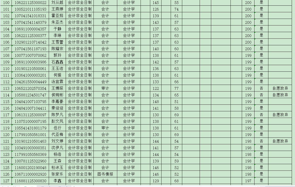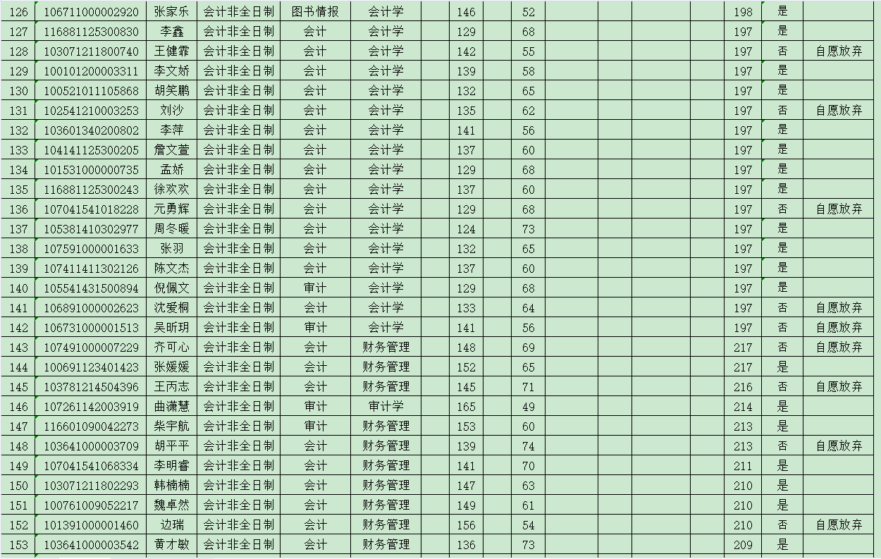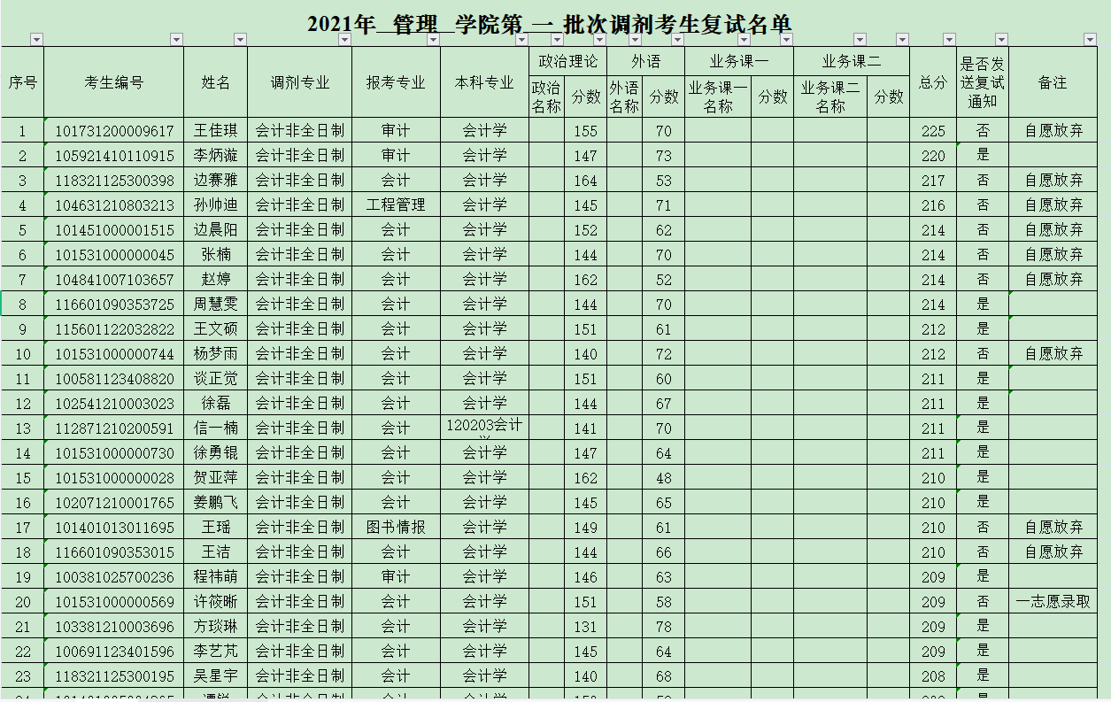 【会计(非全日制)第一次调剂】调剂考试复试名单