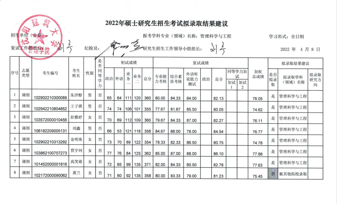 2022年硕士研究生招生考试拟录取结果公示-管理科学与工程全日制