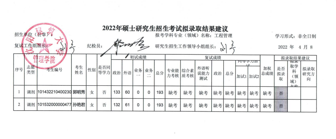 2022年硕士研究生招生考试拟录取结果公示-工程管理非全日制